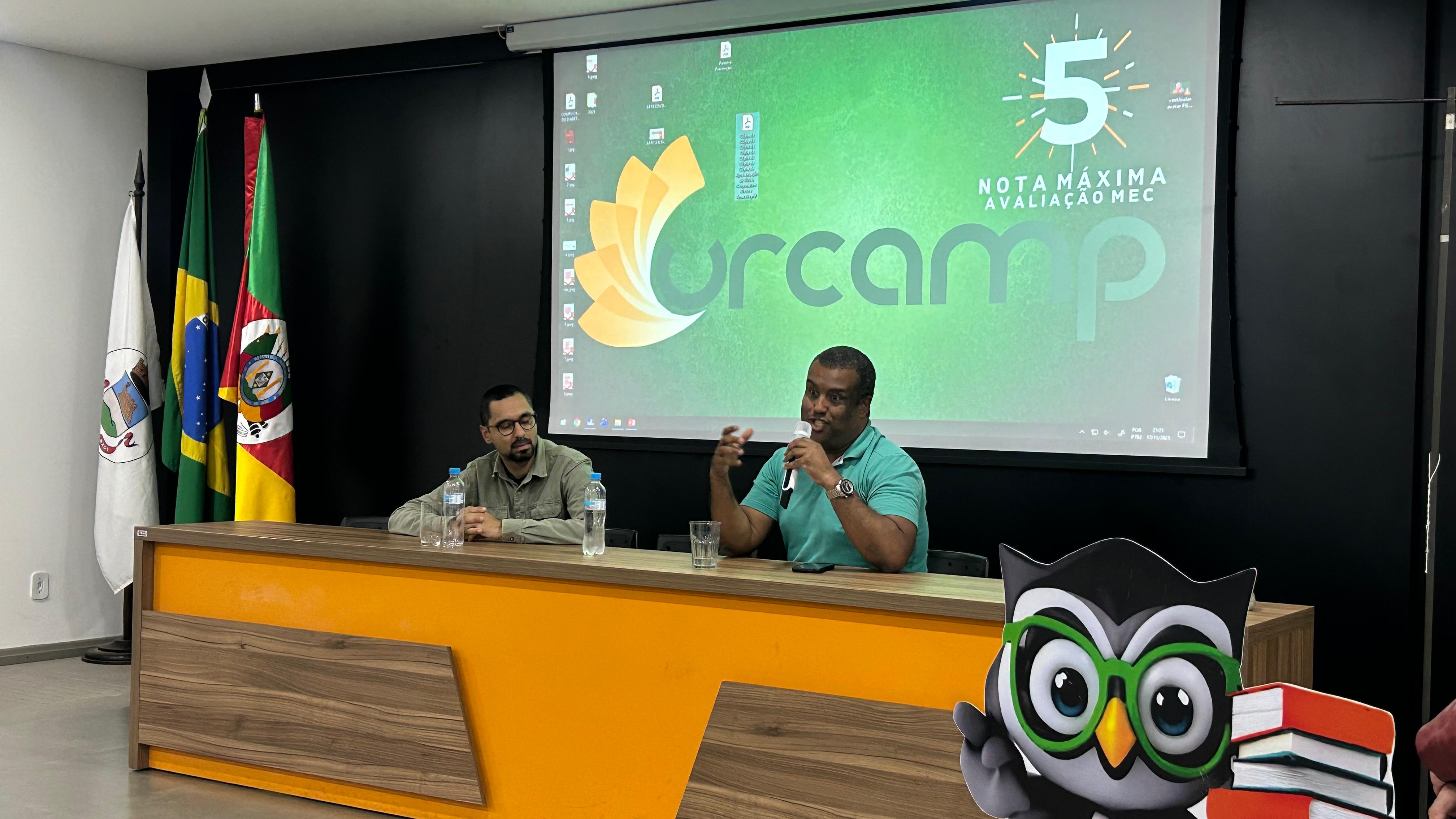 O primeiro convidado foi o professor doutor Rafael Sais, que apresentou o tema “Racismo estrutural na educação: diferentes desafios nos dias atuais”. Formado em Administração pela Urcamp e doutor em Educação pela Universidade Federal do Rio Grande do Sul (Ufrgs), destacou a escola como espaço estratégico no enfrentamento ao racismo, embora ainda marcado por profundas desigualdades. Em sua fala, explicou o conceito de racismo estrutural com base em obras e interpretações consolidadas, abordando suas manifestações na linguagem, nas práticas cotidianas e nas estruturas escolares. Para o docente, compreender o tema é essencial para transformar realidades. “As pessoas precisam entender o que é racismo, como ele se manifesta e por que não vemos negros em espaços de decisão. Esta Semana da Consciência Negra nos convida a refletir sobre nosso papel enquanto sujeitos e futuros profissionais para construir uma sociedade diversa e mais igualitária”, afirmou.