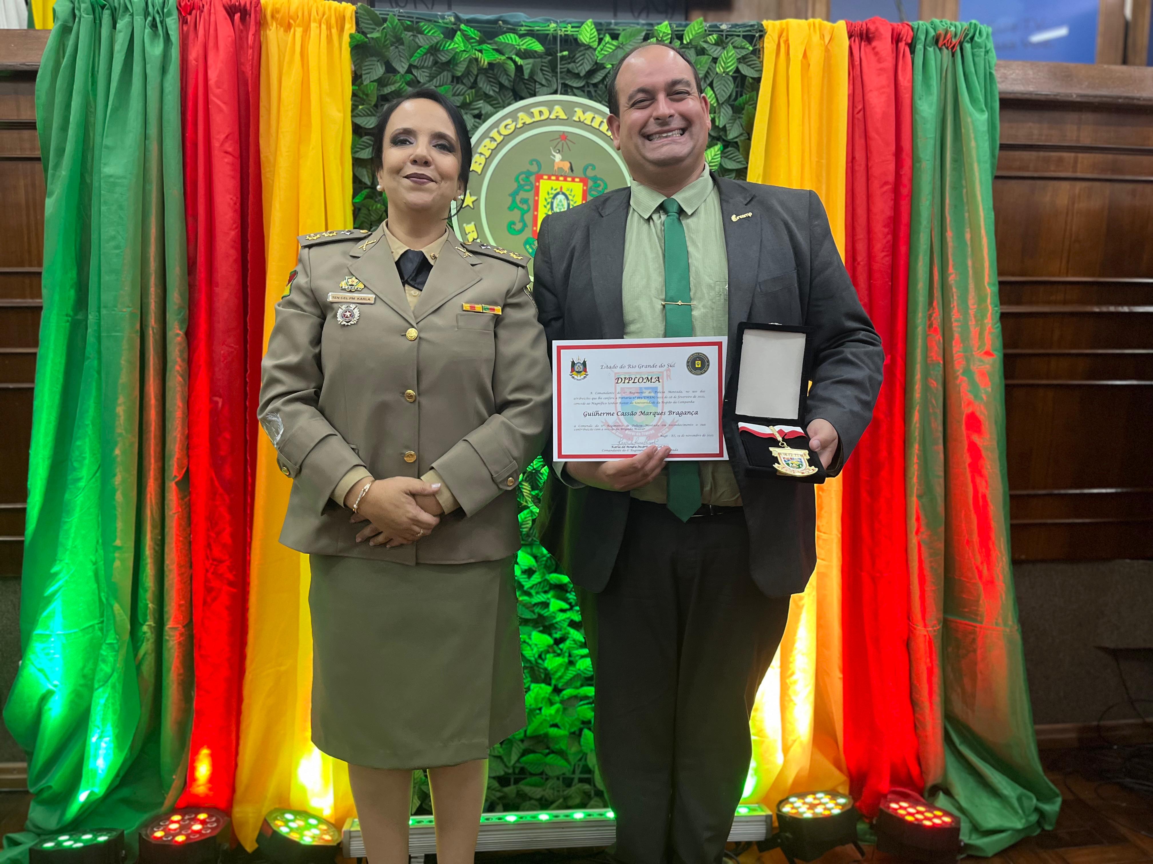 O reitor da Urcamp, professor doutor Guilherme Cassão Marques Bragança, foi uma das personalidades agraciadas com a Comenda do 6° Regimento de Polícia Montada (RPMon). A honraria foi entregue pela comandante do batalhão, tenente-coronel Karla de Moura Incerti, e reconhece ações de aproximação e parceria entre a universidade e a Brigada Militar. "Essa homenagem não é para mim, é para a Urcamp e para todos que constroem a instituição todos os dias", destacou Bragança, reforçando o caráter coletivo da distinção.