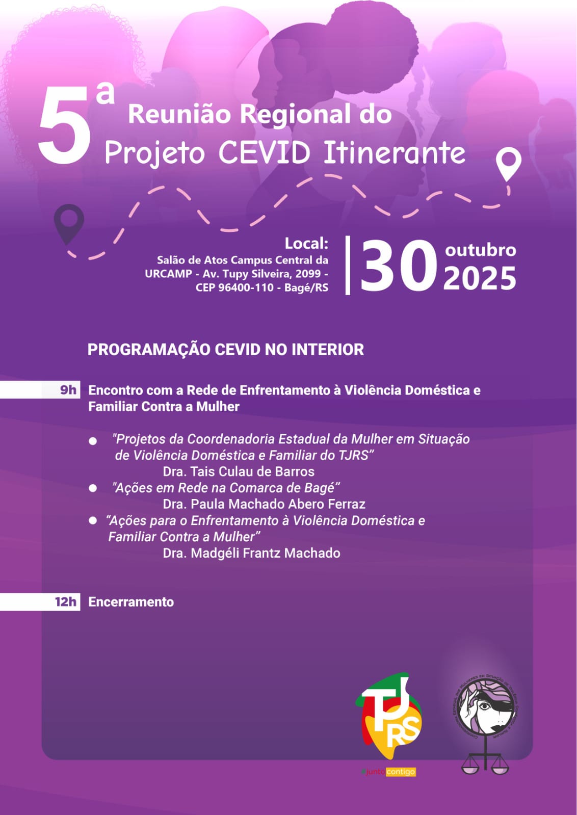 A reunião ocorrerá a partir das 9h, no Salão de Atos do Campus Central da Urcamp, e tem como propósito fortalecer as redes regionais de enfrentamento à violência doméstica e familiar contra a mulher. A atividade reunirá magistradas e magistrados, representantes do Ministério Público, Defensoria Pública, forças de segurança, órgãos municipais e estaduais, além de instituições de ensino, em um encontro técnico e interinstitucional.