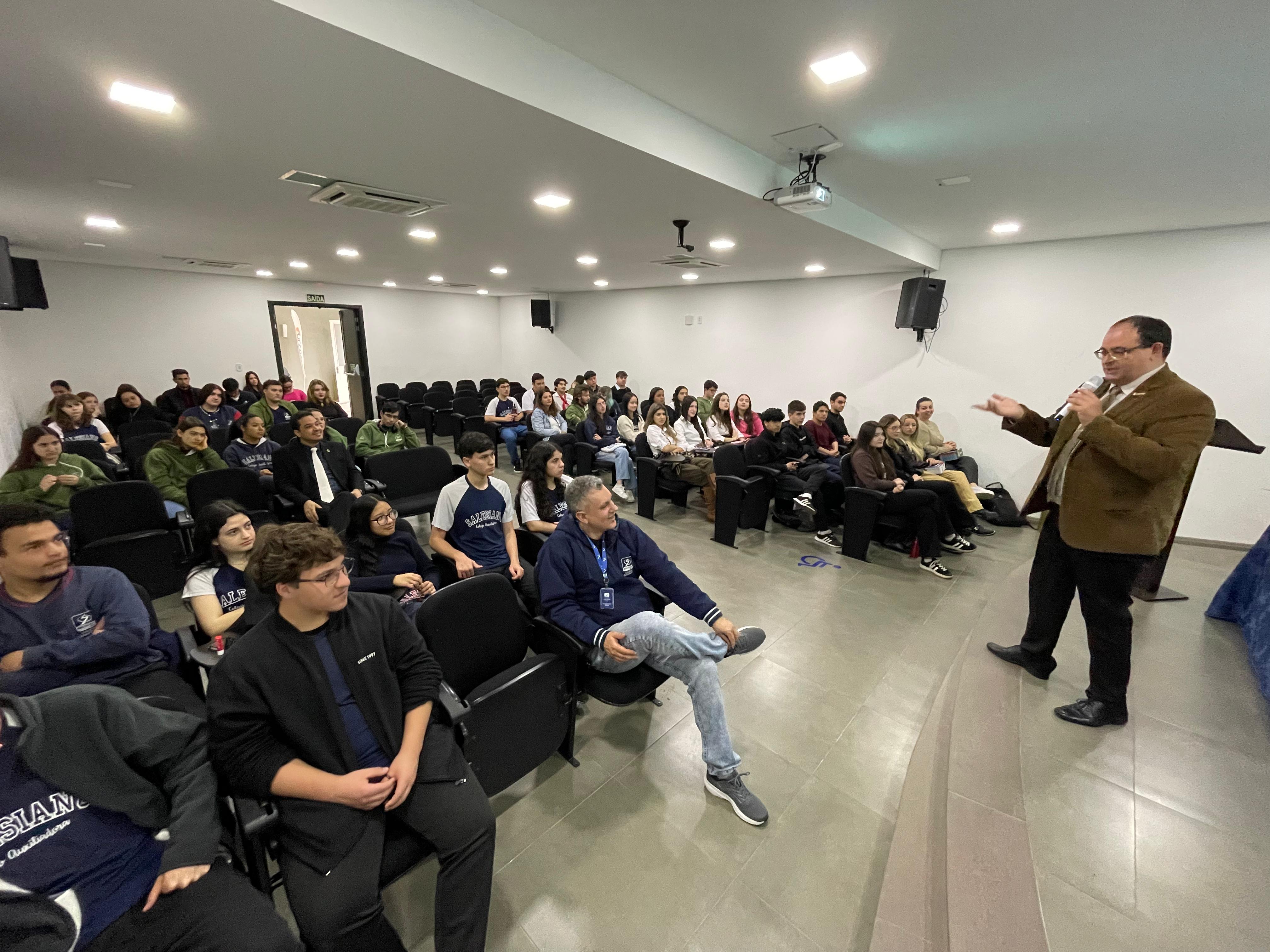 O curso de Direito da Urcamp recebeu 42 alunos do colégio Auxiliadora na manhã desta terça-feira, dia 16, para uma aula de degustação para interessados em conhecer metodologias e temas desenvolvidos nas aulas. “A carreira do Direito historicamente é uma das mais procuradas na Urcamp. Por isso, nós desenvolvemos a ideia de oferecer alguns encontros com nossos professores a fim de que eles ofereçam uma ‘provinha’ do que pode ser cursar Direito na Urcamp” detalha a coordenadora, professora doutora Lourdes Helena Martins.