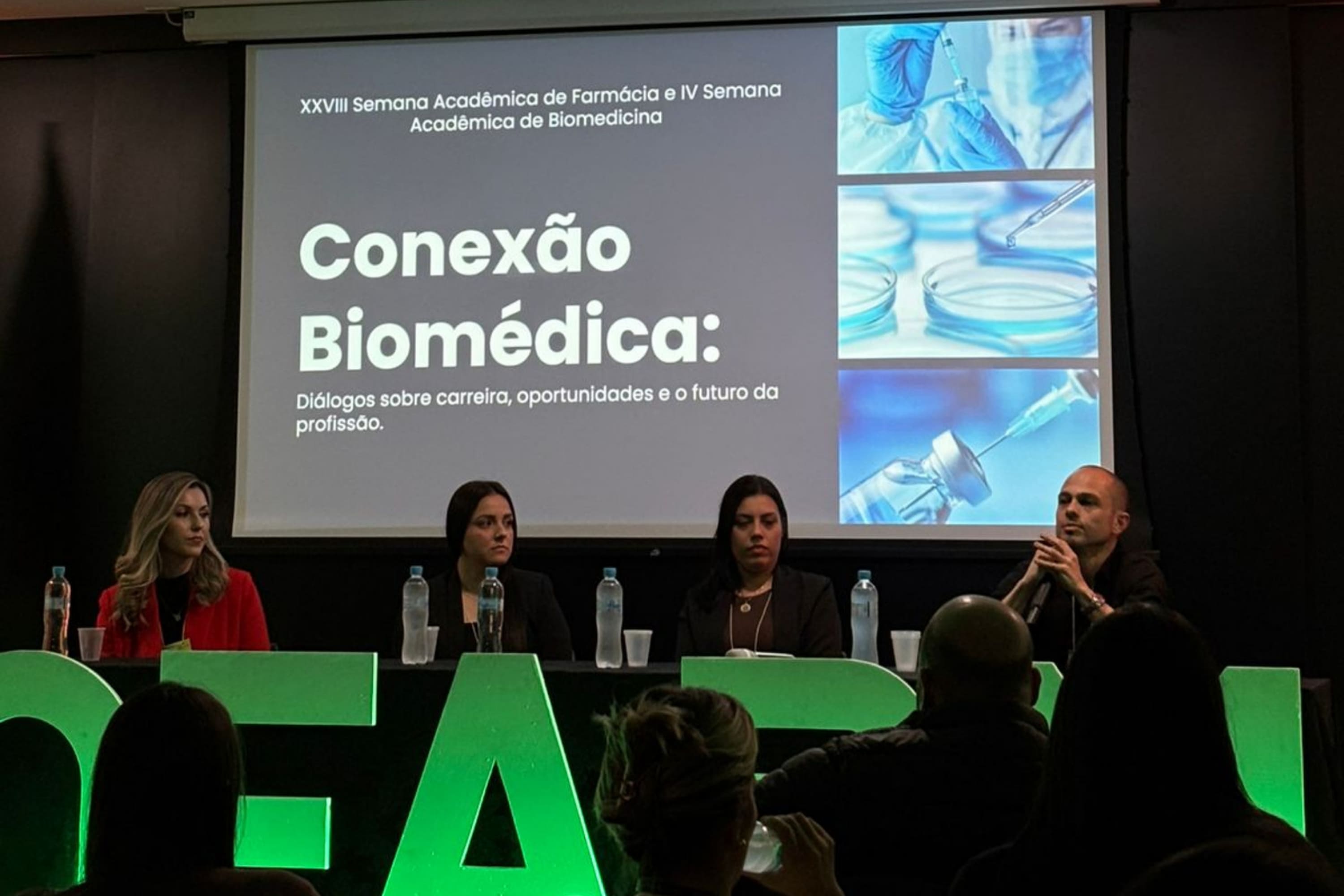 A abertura foi conduzida pela atividade “Conexão biomédica: diálogos sobre carreira e o futuro da profissão”, que reuniu quatro profissionais egressos da Urcamp ou com vínculo direto com a área. Cada convidado compartilhou sua trajetória, desafios e aprendizados no início da carreira.