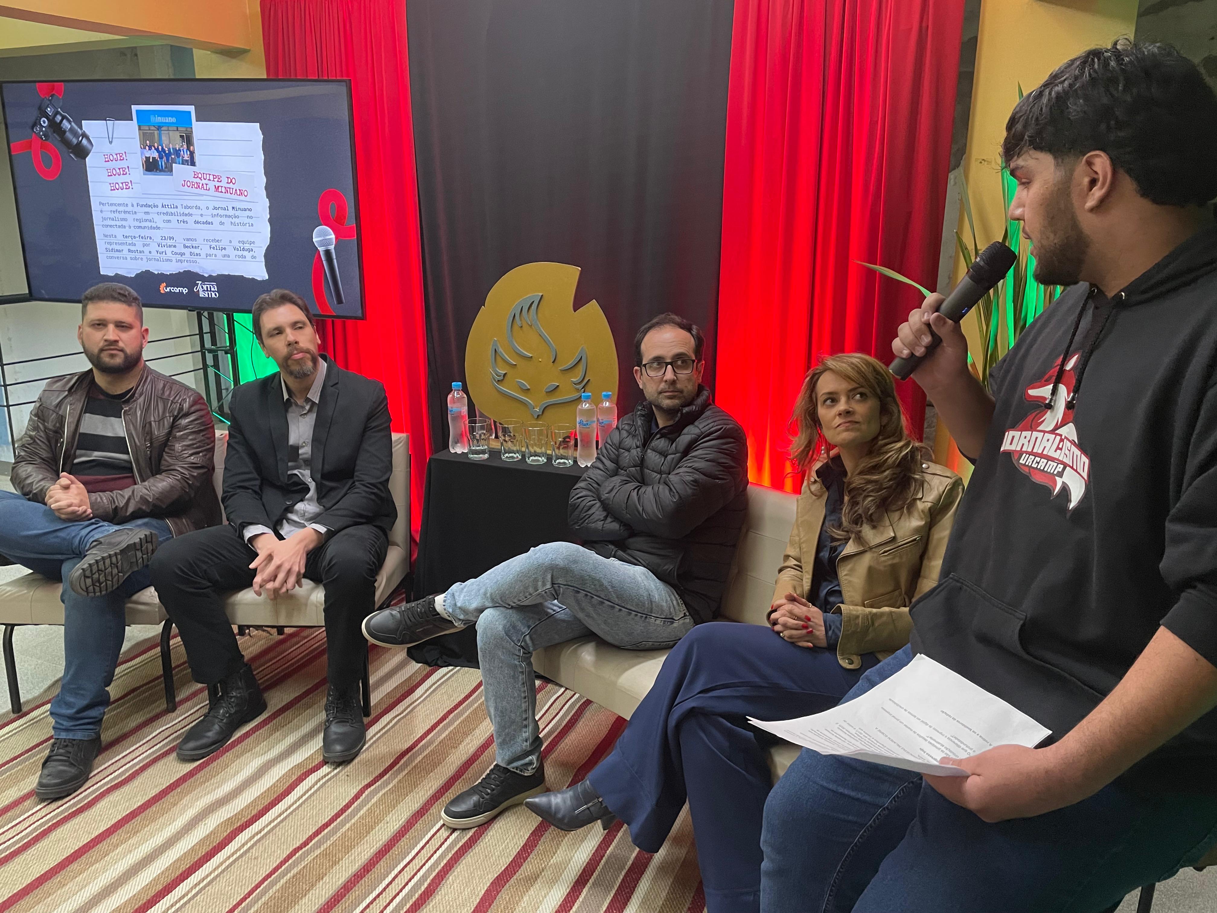 O segundo dia da Semana Acadêmica de Jornalismo da Urcamp, realizado nesta terça-feira, 23, contou com uma roda de conversa conduzida pelo acadêmico Marlon Posqui com a equipe do Jornal Minuano. Participaram os jornalistas Viviane Becker, diretora; Felipe Valduga, editor-chefe; Sidimar Rostan, subeditor; e Yuri Cougo Dias, editor de esportes. Todos são egressos da Urcamp e compartilharam suas trajetórias e percepções sobre o jornalismo impresso.